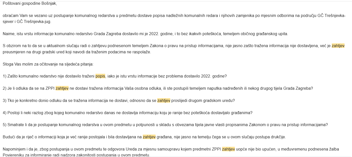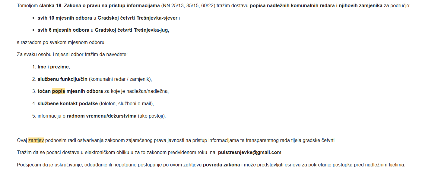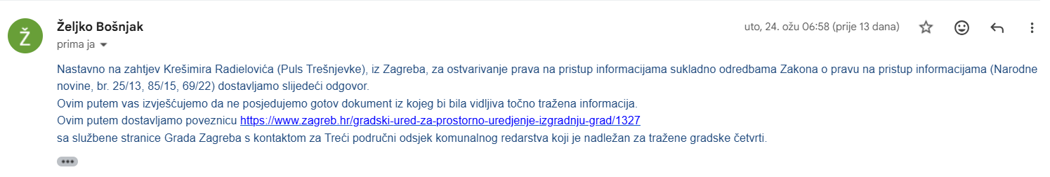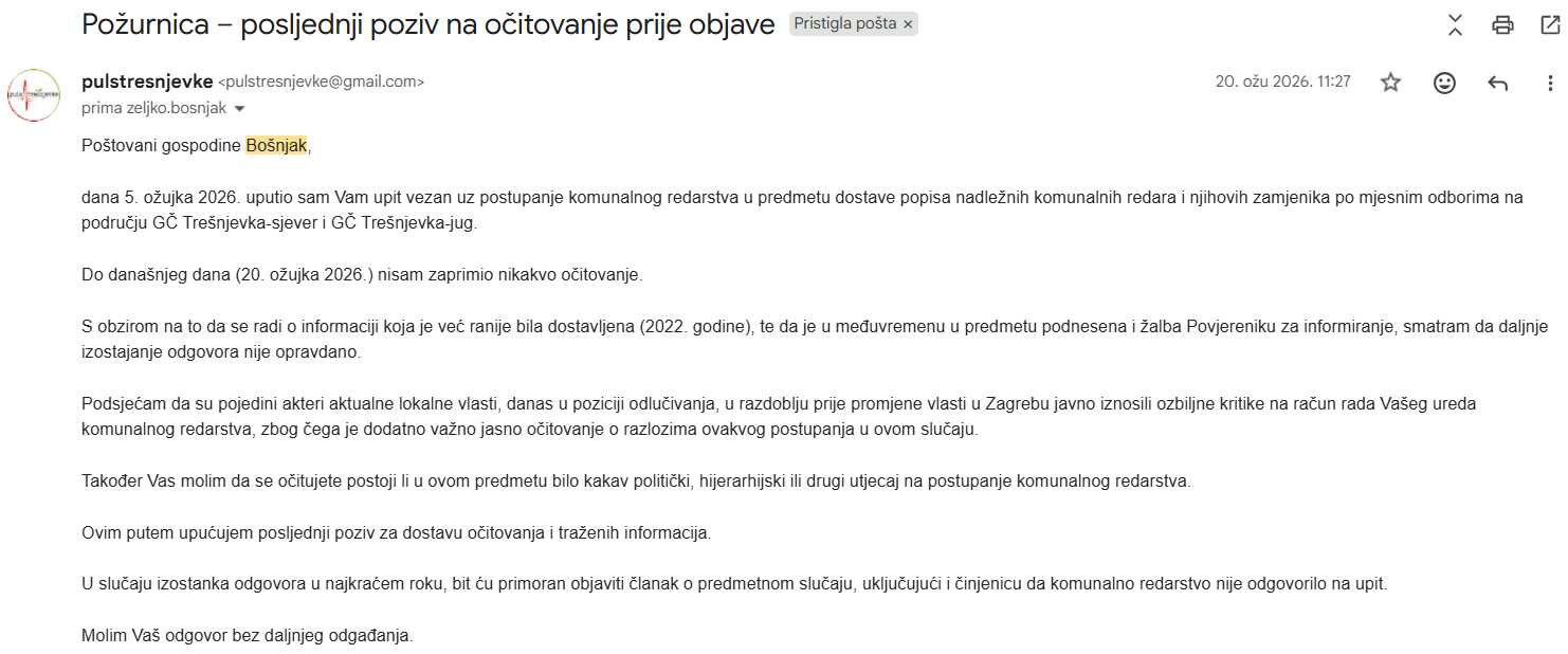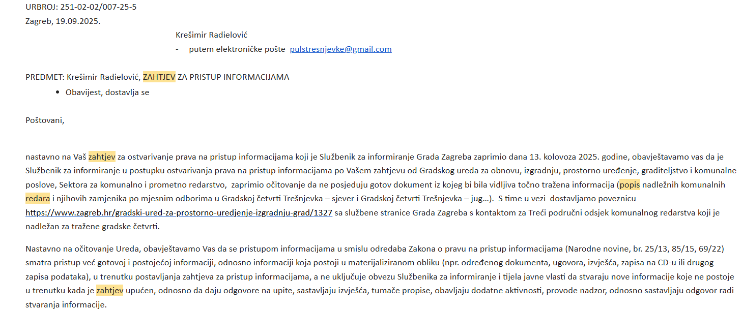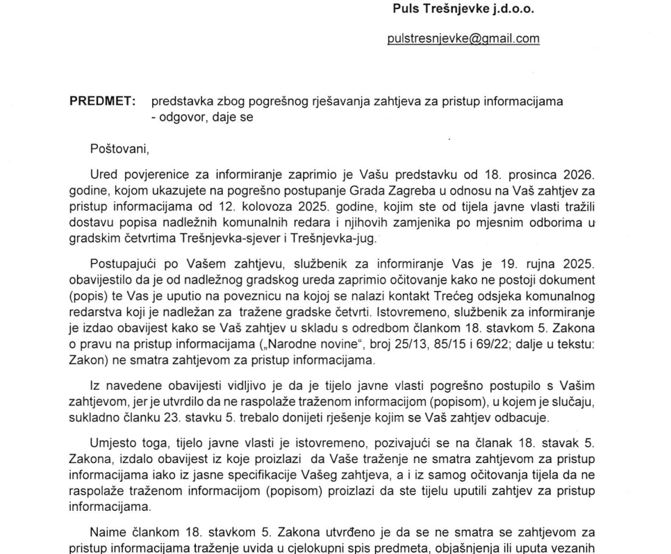 Puls Trešnjevke uputio je još 12. kolovoza 2025. zahtjev za pristup informacijama (ZPPI) vezan uz rad komunalnog redarstva, tražeći konkretan popis nadležnih komunalnih redara i njihovih zamjenika po trešnjevačkim mjesnim odborima. Umjesto traženih podataka, tek nakon žalbe Povjereniku za informiranje je zaprimljen odgovor koji se svodi na opću formulaciju – bez konkretnih informacija i bez jasnog očitovanja.