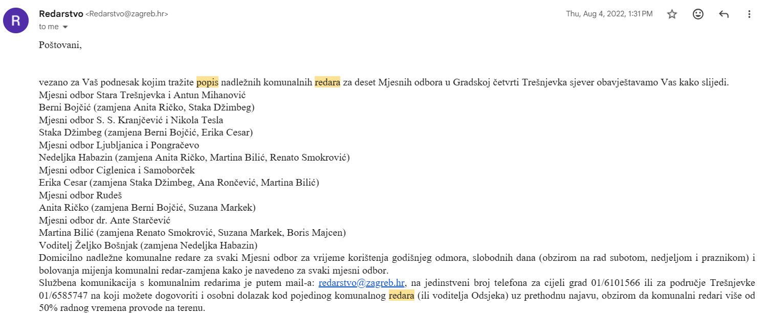 Na konkretan upit o rasporedu komunalnih redara i njihovih zamjenika po trešnjevačkim mjesnim odborima – nakon više od pola godine – stigao je generički odgovor bez traženih podataka i bez očitovanja voditelja nadležnog Trećeg područnog odsjeka komunalnog redarstva koji je 2022. na isti upit odgovorio korektno, sadržajno i bez ikakvih problema.