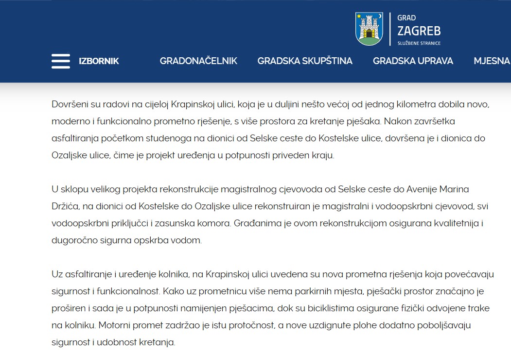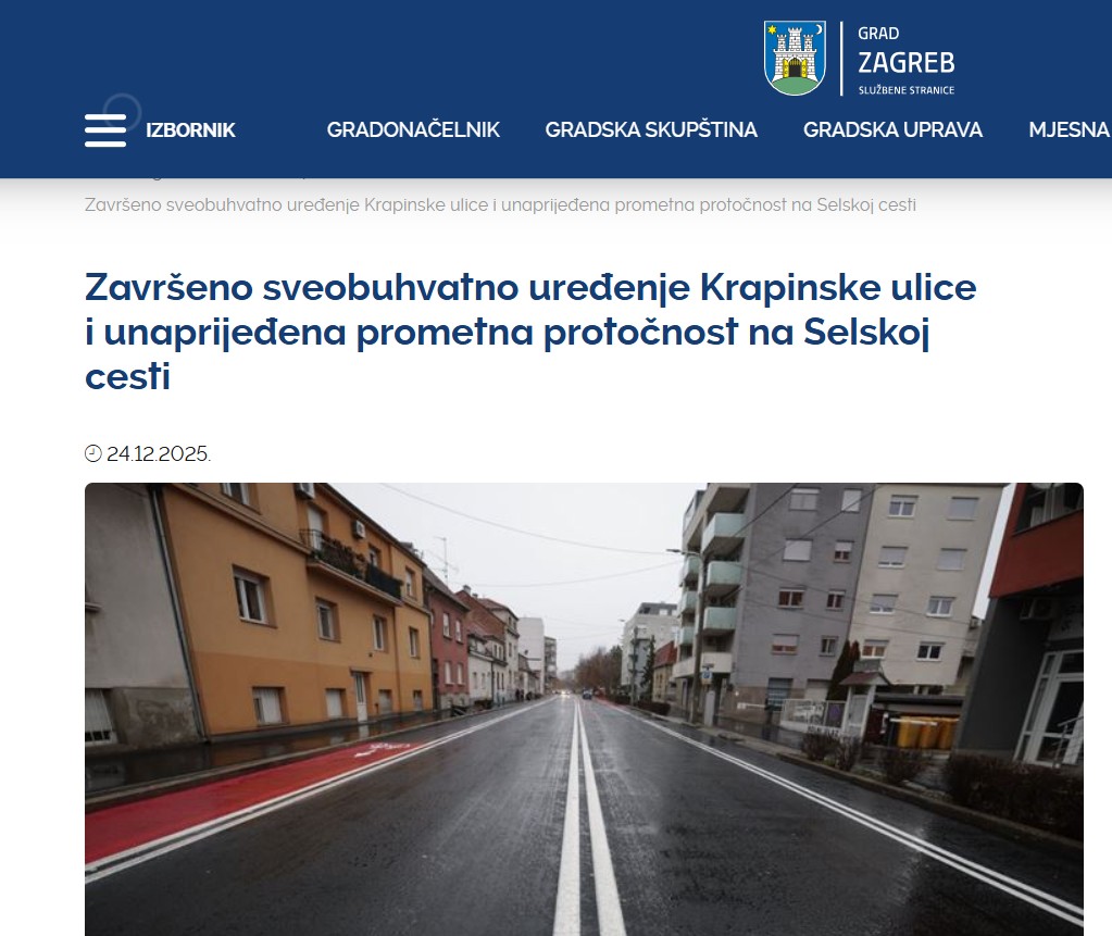 Obavijest o završetku rekonstrukcije Krapinske / snimka zaslona objave na službenoj stranici Grada Zagreba, 24.12.2025.