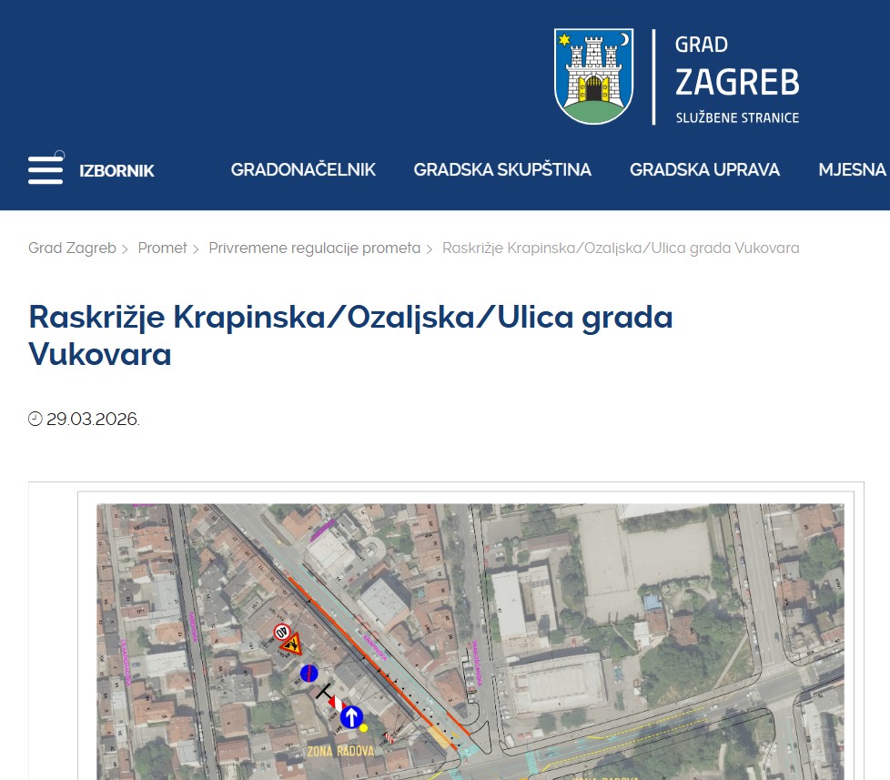 Obavijest o radovima, snimka zaslona objave na službenoj stranici Grada Zagreba, 29.3.2026.