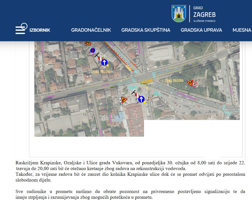 “Raskrižjem Krapinske, Ozaljske i Ulice grada Vukovara, od ponedjeljka 30. ožujka od 8,00 sati do srijede 22. travnja do 20,00 sati bit će otežano kretanje zbog radova na rekonstrukciji vodovoda.