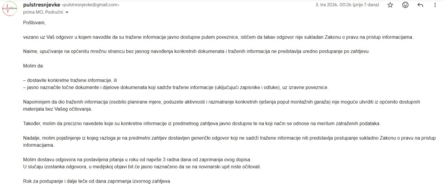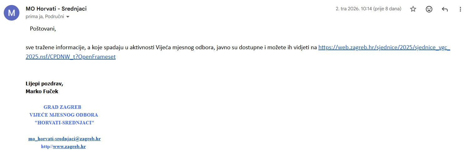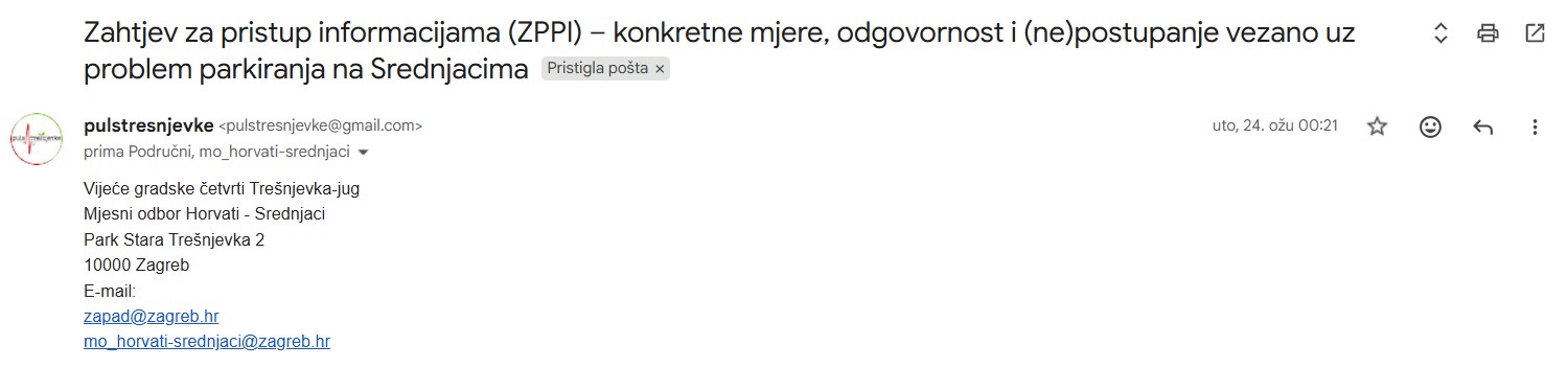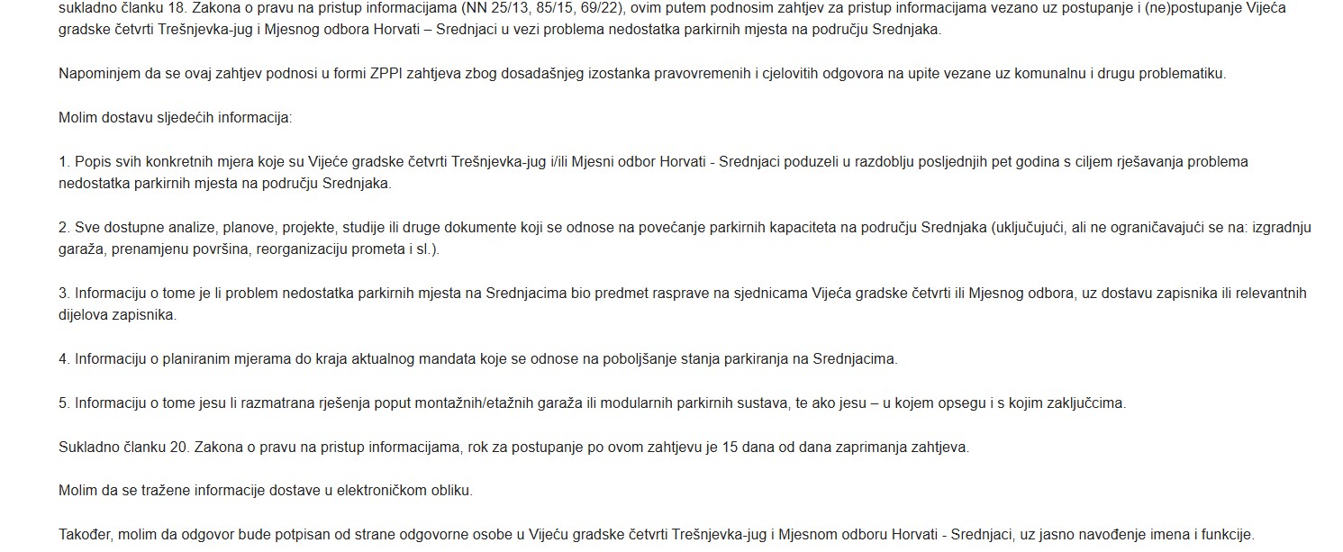 Upravo zbog jasno izraženog interesa građana i konkretnih prijedloga, Puls Trešnjevke uputio je zahtjev za pristup informacijama (ZPPI) Gradskoj četvrti Trešnjevka-jug i Mjesnom odboru Horvati – Srednjaci. Upit je podnesen u formi ZPPI zahtjeva zbog dosadašnjeg izostanka pravovremenih i cjelovitih odgovora na upite vezane uz komunalnu i drugu problematiku. Traženo je da odgovor bude potpisan od strane odgovorne osobe u Vijeću gradske četvrti Trešnjevka-jug i Mjesnom odboru Horvati – Srednjaci, uz jasno navođenje imena i funkcije.