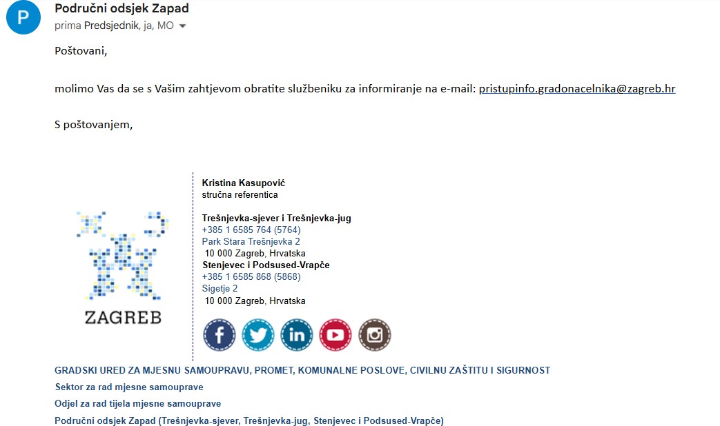 Iz Gradske četvrti stigao je odgovor kojim se, iako je sama Gradska četvrt obveznik Zakona o pravu na pristup informacijama i sama tražena informacija se odnosi upravo na njen djelokrug, Puls Trešnjevke upućuje na drugo tijelo.