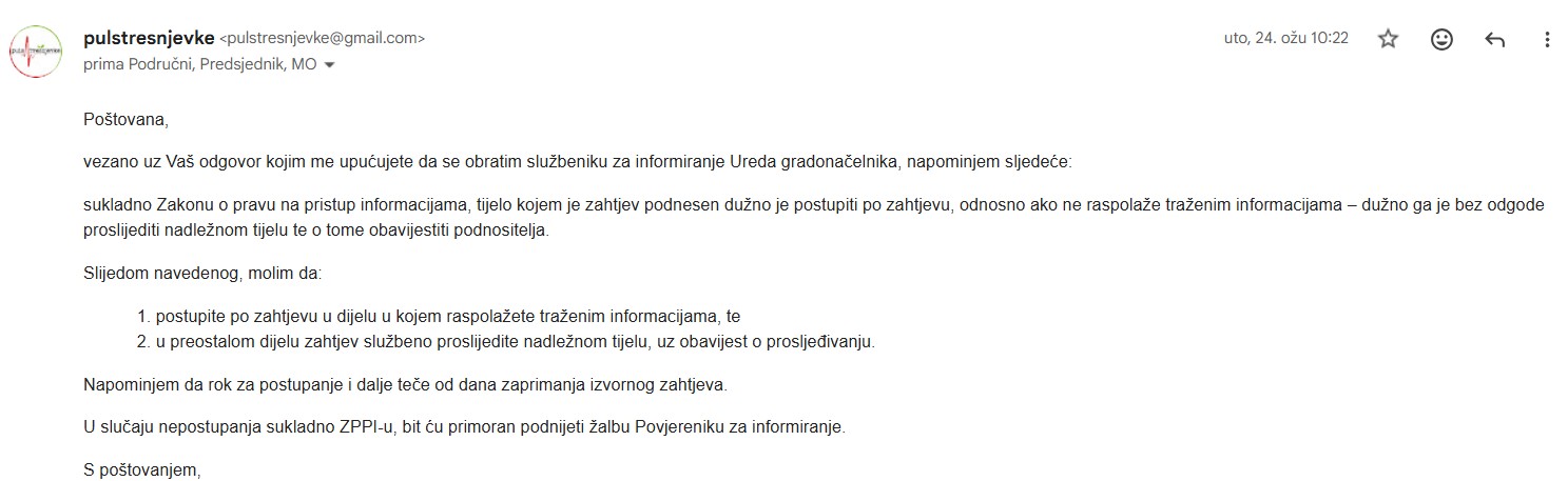 Zbog izostanka zakonitog odgovora u zakonom predviđenom roku od 15 dana, Puls Trešnjevke podnijet će žalbu Povjereniku za informiranje.